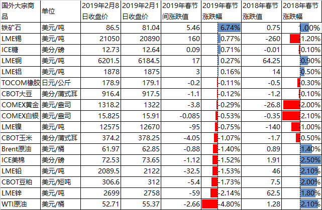 鐵礦石受前期淡水河谷事故的影響、疊加春節(jié)期間淡水河谷礦壩運營執(zhí)照被吊銷和宣布部分合同遭遇不可抗力影響,春節(jié)期間鐵礦石漲幅高達(dá)6.74%,在主要大宗商品中漲幅居于首位。