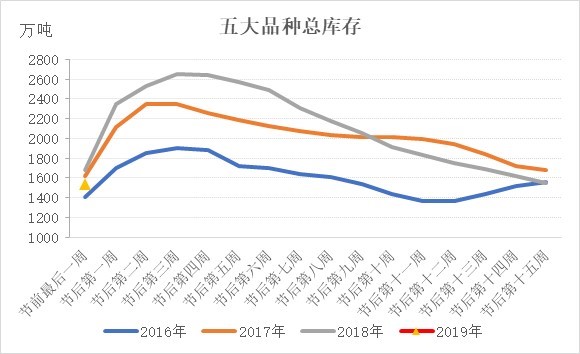 庫存低于去年同期,市場有望出現(xiàn)開門紅行情。根據(jù)Mysteel庫存統(tǒng)計數(shù)據(jù),2019年春節(jié)前最后一周五大品種庫存雖高于2016年,但低于2017、2018年,尤其是螺紋鋼,總庫存低于2018年同期122萬噸。在產(chǎn)量高于去年同期的情況下,需求是好于去年同期的。市場對節(jié)后需求依舊抱有較大期待。